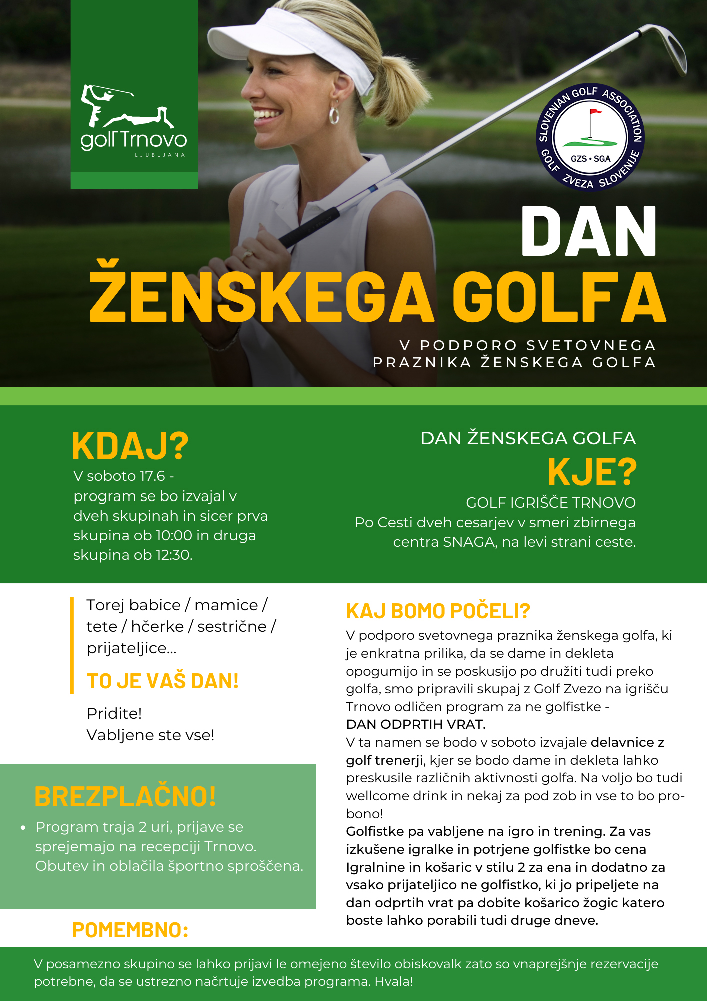V Soboto 17.6 bomo izvedli v sodelovanju z Golf zvezo Slovenije program v čast dneva ženskega golfa katerega 9.6 zaradi vremenskih razmer ni bilo moč izvesti.