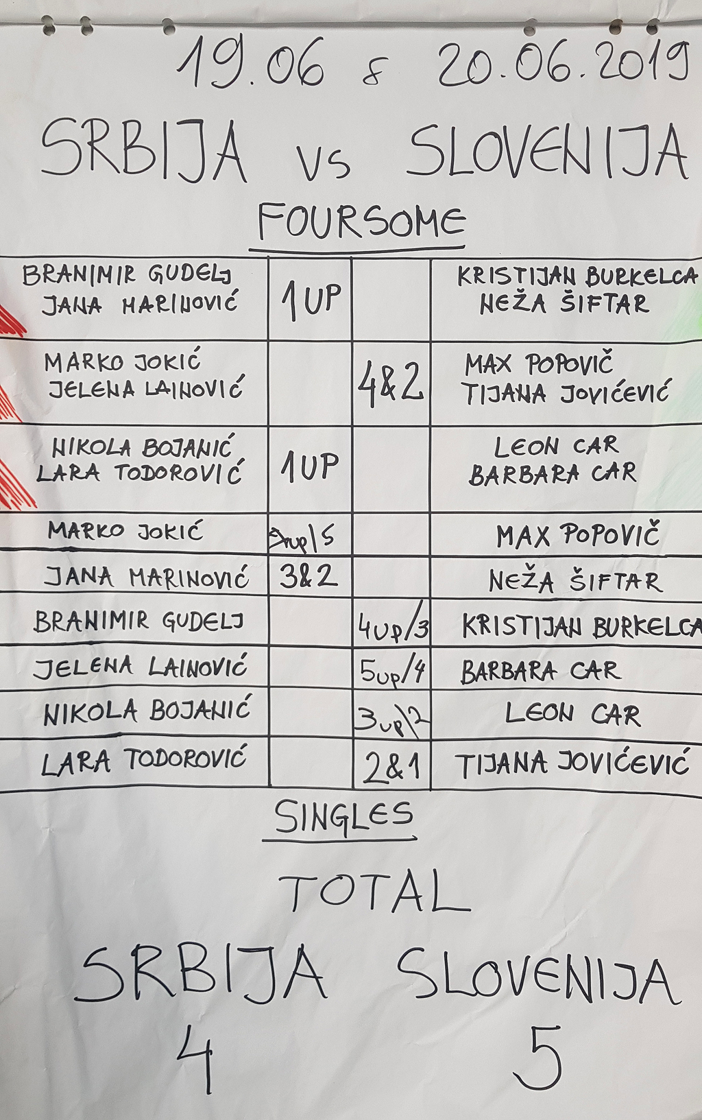 Max in Tijana 3 luknje pred koncem vodita 3 up in bosta match prav gotovo dobila. Leon in Barbara sta po zaostanku dveh lukenj odigrala zadnjih 6 lukenj odlično, dobila 3 in izgubila eno luknjo kar zadostuje da sta para izenačena tri luknje pred koncem.