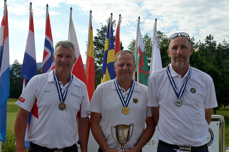 V moški konkurenci sta se do zadnje zelenice borila Šved Mattias Pernheden in Nemec Martin Birkolz, ki je na koncu le uspel in zadel zmagovalni pat ter tako s skupno šestimi udarci postal evropski seniorski prvak. Mattias Pernheden, ki je tudi bil med petimi nesrečniki brez svojega seta palic do prvega dne tekmovanja, se je s sedmimi udarci čez par moral zadovoljiti z drugim mestom. Tretji pa je z najboljšim rezultatom 70 udarcev v tretjem dnevu in skupno devetimi udarci čez par bil Danec Tony Jensen.