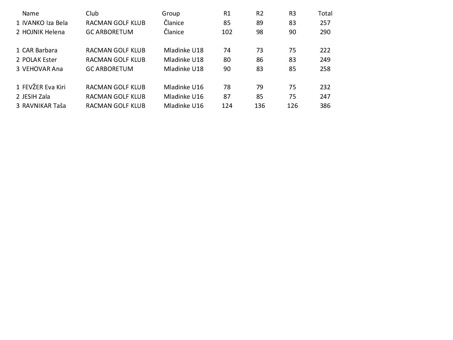 Pri dekletih je prva ekipa Racman (Car, Polak in Ivanko) že po uvodnem krogu vodila z 11 udarci, po drugem celo 16 in vprašanje zmagovalk je bilo rešeno pred zadnjim dnem. Zadnji dan je za ekipo Racman 2 odlično odigrala Zala Jesih, tudi Ana Vehovar (Arboretum) je dvignila formo, a rezultatski zaostanek je bil prevelik.