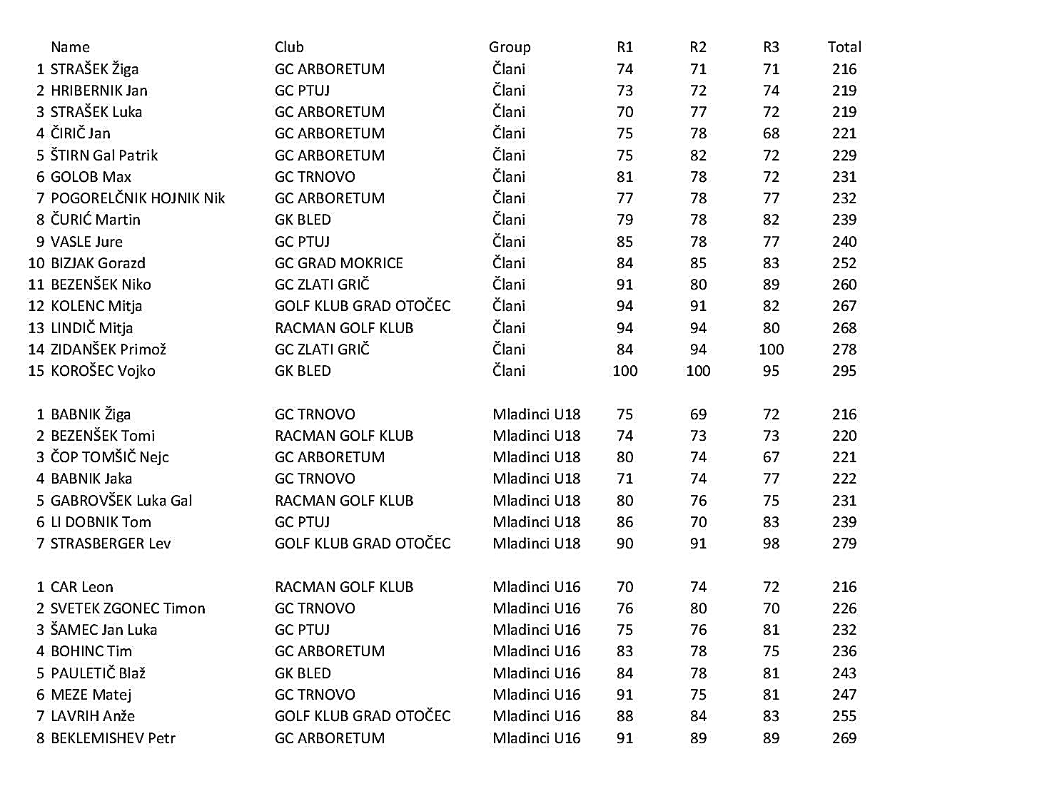 Skupni najboljši rezultat (216 udarcev / +3) so dosegli kar trije igralci: Leon Car (Racman), Žiga Babnik (Trnovo 1) in Žiga Strašek (Arboretum 2), kar je vsakemu od njih prineslo naslov državnega prvaka v kategorijah U16, U18 in člani. Po dnevni formi je kakovost še malce bolj razpršena, saj sta bia po prvem krogu najbolj uspešna Luka Strašek in Leon Car (70), v drugem Žiga Babnik (69), pa tudi Tom Li Dobnik (70) in v tretjem Nejc Čop Tomšič (67) in Jan Čirič (68).