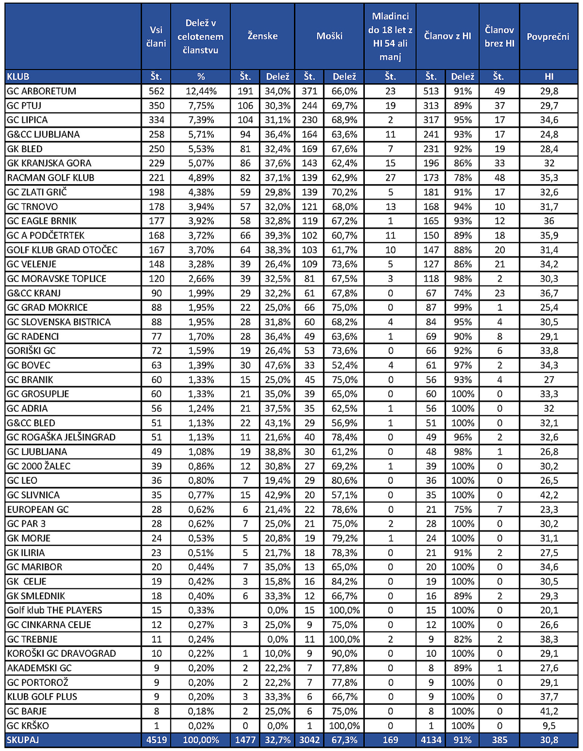 STATISTIČNI PODATKI ČLANSTVA PO KLUBIH ZA 2020 NA PODLAGI IZDANIH LICENC GZS