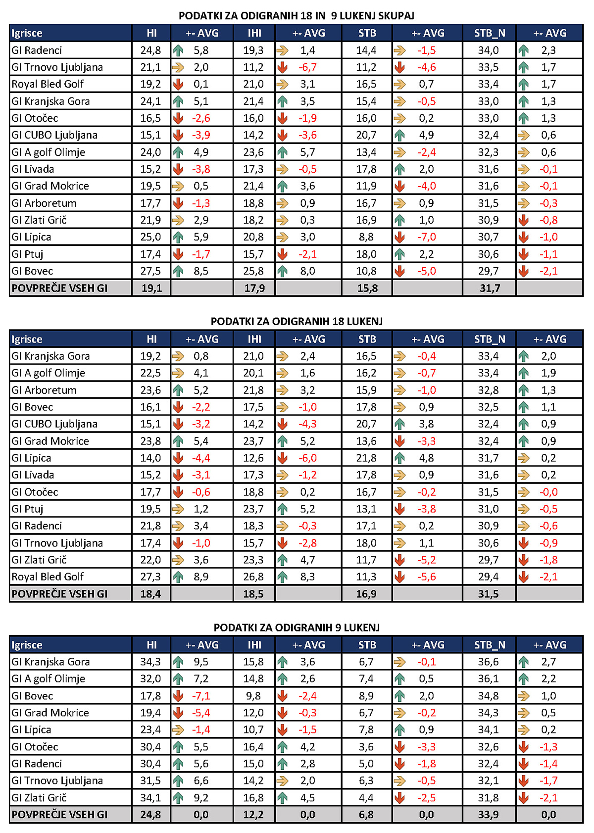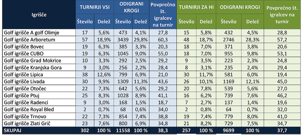 1. V tabeli 1 je prikaz odigranih turnirjev in krogov na slovenskih igriščih v letu 2020. Prvi del (modro) so prikazani podatki za vse zaključene turnirje, ne glede na obliko tekmovanja. Na desno strani je pregled (zeleno) odigranih turnirjev, ki so veljali za spremembo HI (hendikep indeksa).