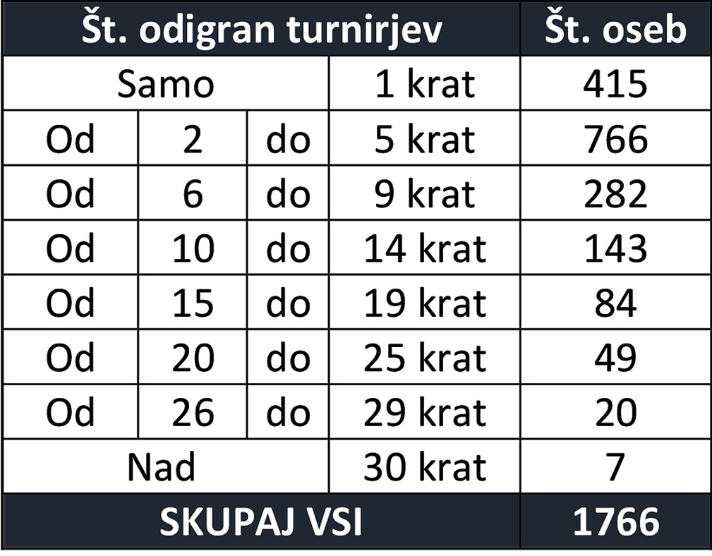 2. V tabela 2 prikazuje pogosto igranja različnih oseb z Licenco GZS na turnirjih za spremembo HI, ki so razdeljene v smiselne grupe pogostosti igranja. Iz podatkov lahko vidimo da je od vseh oseb z licenco GZS igralo na turnirjih samo 1766 različnih oseb.