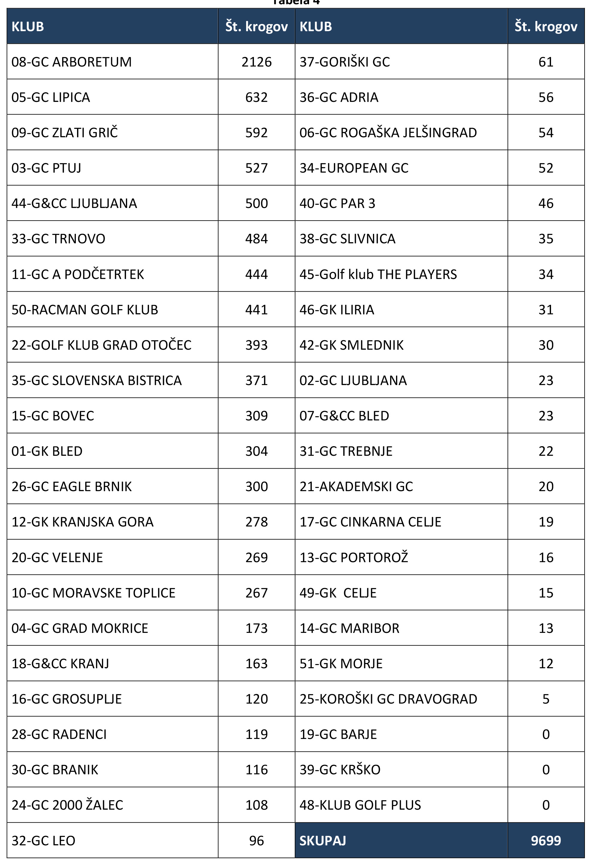 4. Tabela 4 prikazuje število krogov, ki so jih odigrali na turnirjih za spremembo HI v letu 2020 člani posameznih klubov.
